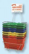 Baskets can be purchased in case packs of 18 or as sets of 12 including this floor display stand and imprinted header sign.